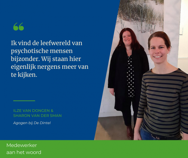 Ilze van Dongen en Sharon van der Sman zijn allebei werkzaam als agoog bij afdeling De Dintel van GGzE. Dit is een besloten afdeling voor mensen met complexe, psychotische problematieken. Ze werken al 16 jaar samen. Dat ze blij zijn met elkaar, straalt er vanaf.