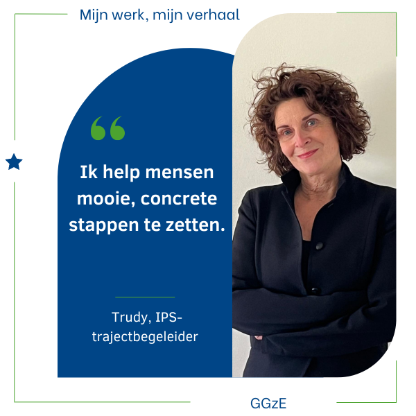 IPS (Individuele Plaatsing en Steun) is sinds de jaren 2000 in Nederland een erkende re-integratiemethodiek. Het traject richt zich op passend werk vinden én behouden voor mensen met psychiatrische problematiek. Binnen GGzE is het modelgetrouw geïmplementeerd, met Trudy als een van de drijvende krachten. In elk gebiedsteam zit een IPS-trajectbegeleider. Wanneer een cliënt de wens voor betaald werk uitspreekt, komen zij in beeld. Trudy merkt dagelijks hoe belangrijk werk is in het herstelproces. “Het uitspreken van de wens voor werk spreekt hoop en toekomstgerichtheid uit. Ik denk met ze mee: wat zou je willen? Het is niet puur een kwestie van werk vinden,” legt Trudy uit. “Het gaat om het vinden van vertrouwen in jezelf en uitzoeken wat passend is. En dat soms een stap terug ook een stap vooruit is.”